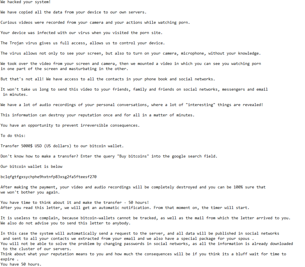 Like with all sextortion scam emails, the sender of the “Consider This Message As Your Last Warning” email claims that your system has been hacked and data stolen. The sender claims that your computer has been infected with a Trojan virus that gave them full access and control over your device. The sender further alleges to have spied on you through the camera and microphone and claims to have created a video showing you watching pornography alongside the explicit video you were supposedly watching. They then threaten to distribute this video to all of your contacts unless $5,000 in Bitcoin is paid.