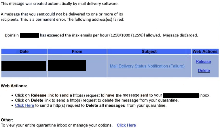 Domain – has exceeded the max emails per hour (1250/1000 (125%)) allowed. Message discarded.Date From Subject Web Actions