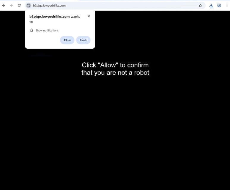 lowpedriliks.com has nothing on it, displaying only a message saying you need to click “Allow” to confirm you are not a robot. This is referring to the browser alert saying “lowpedriliks.com wants to show notifications”. By clicking “Allow”, you will permit the website to display advertisements on your desktop. The biggest issue with these ads is that they may resemble legitimate system alerts, potentially misleading you into interacting with them. It is recommended not to engage with any of these notifications, as they may redirect you to malicious sites promoting scams or hosting malware.