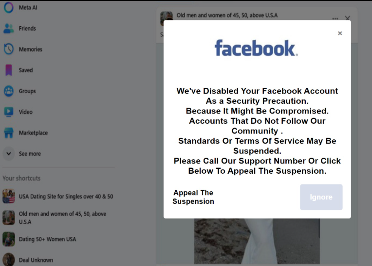 You may be redirected to the site hosting this “We’ve Disabled Your Facebook Account” scam by ad-heavy sites or if adware is installed on your device. The site displays a fake Facebook feed in the background, so it’s fairly obvious that it’s not your profile. The name, photos, and other content will be random. You won’t be able to interact with the page because a pop-up will immediately appear, saying Facebook has disabled your account as a security precaution. The pop-up mentions that you can lift the suspension if you call the support number.