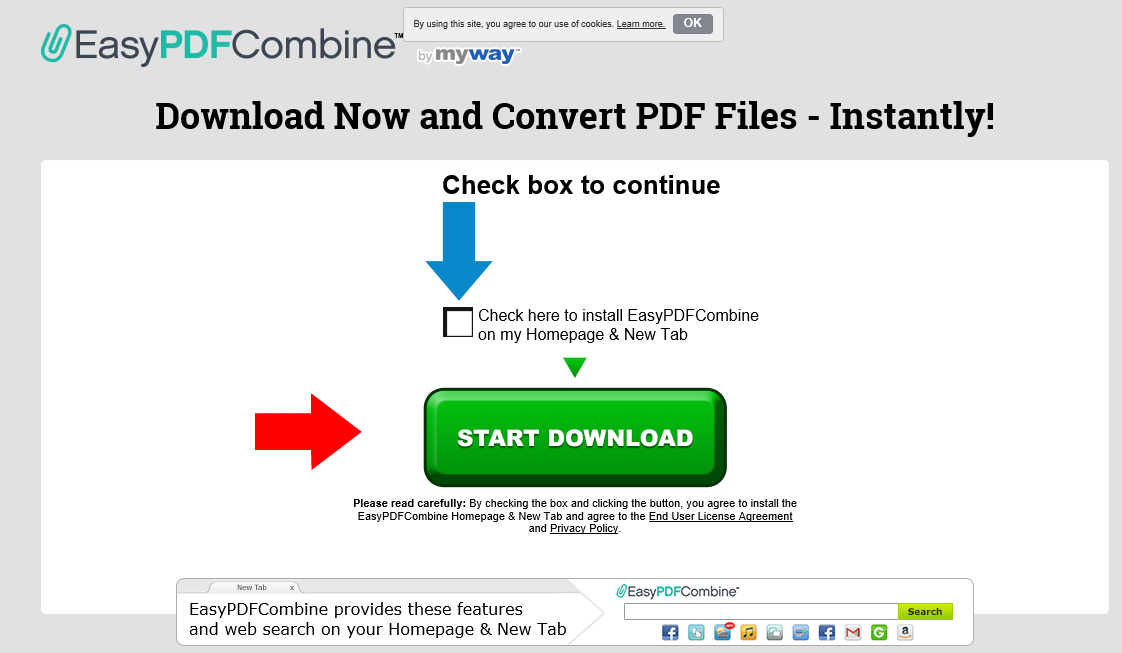 As for the EasyPDFCombine toolbar, it becomes visible at the top of every browser after the installation of this application. Both homepage and new tab page settings are changed too, so users no longer see the website they have been using. Instead, they see a new page with a search box in the middle. It displays search results too, but, unfortunately, they are far from being trustworthy search results. They cannot be trusted because they redirect straight to third-party websites. Dangerous things might be found there, so users should be cautious. In fact, it would be best to stop using the search tool promoted by EasyPDFCombine completely. Malware experts say that EasyPDFCombine is called a potentially unwanted program not only because it distributes suspicious search tool. They have managed to find that this browser plugin might also monitor users’ activities on the web and then record information about them. The longer this browser plugin is kept installed, the more problems might emerge. This might happen during the shortest period of time.