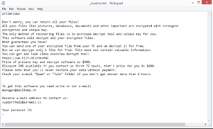 Nqsq ransomware comes from the same malware family as Tisc, Rigd, Koom, and Hoop. All versions are more or less the same, but they can be differentiated by the extensions they add to files they encrypt. In this case, it would be .nqsq. For example, image.jpg would become image.jpg.nqsq. All files with this extension will be unopenable unless they are first put through a decryptor. All personal files will be targeted by ransomware, including photos, videos, documents, images, etc. While the ransomware is encrypting files, it will show a fake Windows update window. Once files are done being encrypted, a _readme.txt ransom note will be dropped in all folders containing encrypted files. The note explains it’s only possible to decrypt files using a special decryptor that victims can buy for $980, or $490 if contact is made within the first 72 hours. Unfortunately, it is correct that files can only be decrypted using that decryptor. Nonetheless, it’s not a good idea to pay the ransom.