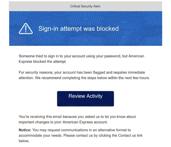 Another key indicator of phishing emails is poor grammar and spelling, which are pretty obvious red flags. Though the “American Express – Sign-in Attempt Was Blocked” email does not have glaring mistakes, it does not look professional enough to be sent by a sender like American Express.