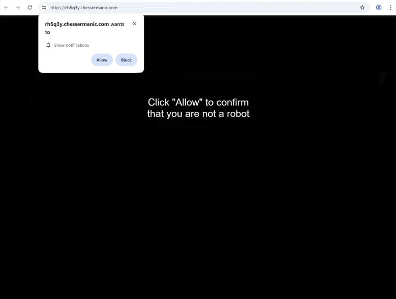 chessermanic.com is a scam website that tricks visitors into enabling desktop ads. The site prompts the browser to show the “chessermanic.com wants to show notifications” alert, and clicking “Allow” will result in ads on the desktop. This “show notifications” feature is legitimate, and granting a site permission allows the site to display notifications on your desktop. However, when permission is given to sites like chessermanic.com, the notifications are ads, some of which could be harmful by exposing you to malware or scams. If chessermanic.com has permission, it’s important to revoke it immediately through your browser’s settings. Instructions can be found at the end of the report in case you need help.