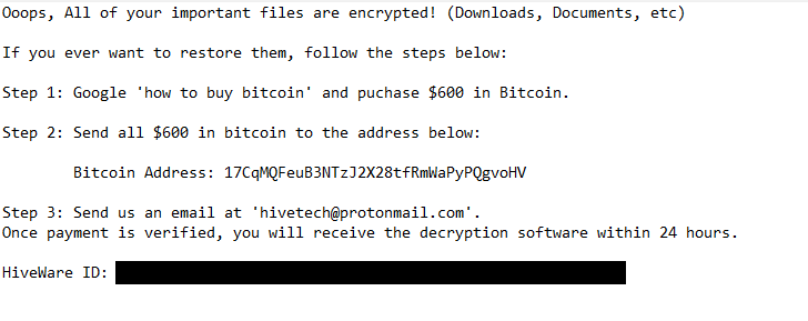 Once payment is verified, you will receive the decryption software within 24 hours.HiveWare ID: –