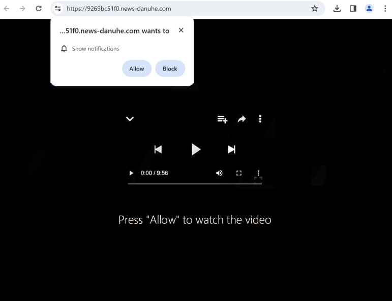 news-danuhe.com is a deceptive website and has no content on it, besides an image of a video player and a message saying you need to click “Allow” to watch the video. Upon accessing the site, a browser notification will immediately appear saying “news-danuhe.com wants to show notifications”. Because news-danuhe.com is a deceptive website, clicking “Allow” will result in advertisements being displayed on your desktop. A significant concern is that these ads may mimic legitimate system notifications, which could potentially lead users to interact with them. The ads could expose users to malicious content, including malware or scams.