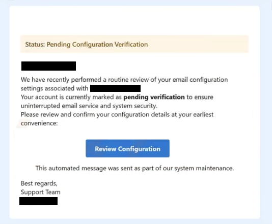 The main purpose of this scam is to trick recipients into revealing their email login credentials. To achieve this, the message includes a link—often labeled something like “Review Configuration” or “Verify Settings.” When clicked, this link redirects the user to a fake login page designed to closely resemble a real email service such as Gmail or Yahoo.