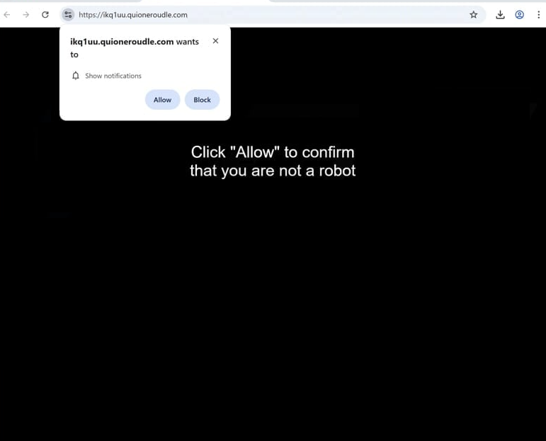 quioneroudle.com has no content on it, besides a message saying you need to click “Allow” to confirm you are not a robot. Immediately upon entering the site, a browser alert will appear saying “quioneroudle.com wants to show notifications”. While the site may imply that clicking “Allow” grants you access to the site, permitting it will actually result in the site bombarding your desktop with advertisements. If you have already given it permission, do not interact with these ad notifications, as they may lead to scams or trick you into downloading unwanted or even malicious software. If you have already enabled this site to show notifications, you need to revoke this permission immediately. Detailed steps to help you will be provided at the conclusion of this report.