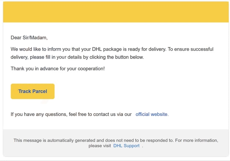 Malicious actors often disguise phishing emails as parcel delivery notifications, as it’s an effective tactic to get users to open attachments or click on links. This particular phishing campaign claims that DHL is about to deliver your package, but needs some details. The email doesn’t have a lot of information, but it asks that you click the provided button and enter your details.
